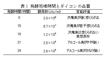 塩蔵ダイコンを脱塩後、調味液(5%グルコース、10%アミノ酸液、0.25%酵母エキス)に漬け、ワイン醸造用酵母を添加し、30℃で18時間撹拌しながら発酵させることにより、沢庵臭のない沢庵を製造できる。 |