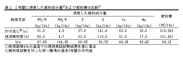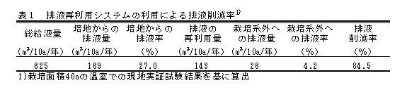トマト養液栽培における排液再利用システムは排液を85%削減し、栽培系外へ排出する肥料成分量を減少させ、環境負荷を軽減できる。さらに、肥料使用量が減少するため肥料費を70%に節約できる。 |