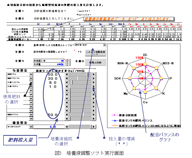 トマト養液栽培で排液再利用システム利用時に、定期的な排液中の肥料成分分析結果を基に培養液を調整するソフトを開発した。本ソフトの利用により、農家自身がパソコンを用いてデータ入力、施肥バランスのシミュレーション、施肥量計算などを迅速かつ簡便にできる。 |
