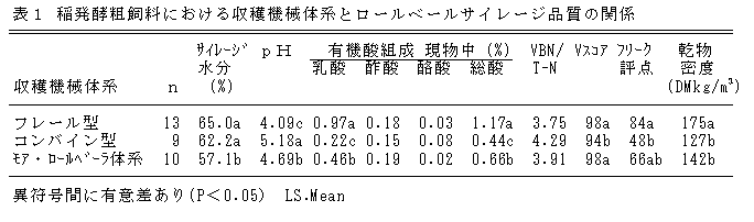 稲発酵粗飼料は水分を70%程度以下に調整すれば、いずれの収穫機械体系でも酪酸やVBN/T-N(比)が少なくVスコア80以上のロールベールサイレージとなる。また、「フレール型」で調製したサイレージは、他に比較して乾物密度が高く、乳酸が増加しpHが低下してフリーク評点が高い。 |