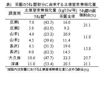 黒ボク土のかぶせ茶園において一年間に無機化する土壌窒素量のうち、23~63%がうね間部分に由来する。うね間部表層土壌における土壌窒素無機化量は熱水抽出窒素量によって評価することができる。 |