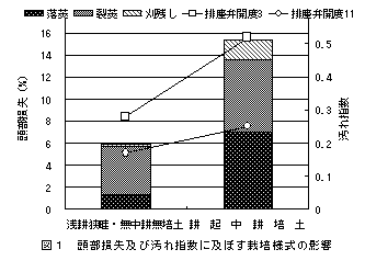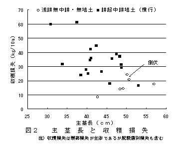 浅耕狭畦無中耕・無培土栽培大豆のコンバインによる頭部損失は、中耕培土栽培に比べ1/3程度に低下する。また、土の掻き込みの危険が低いことから汚粒の発生も低く抑えられる。無中耕無培土によるコンバイン作業速度の向上により、浅耕狭畦・無中耕無培土栽培でも70cm条間の耕起中耕培土栽培と同等の作業能率が確保される。 |