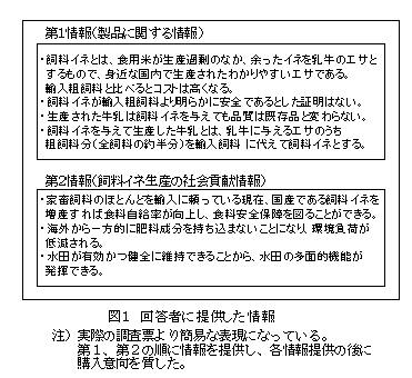 輸入粗飼料の代替として飼料イネを給与して生産した牛乳を想定し、消費者の購買選好を調査したところ、製品情報に加え、飼料イネ生産の外部経済効果に関する情報を提供することで既存品より割高であっても購入する確率が高くなり、またその支払い意志額は30円/Lであった。 |