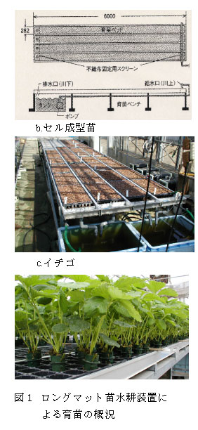 水稲のロングマット苗移植技術で使用される水耕装置は葉菜類のセル成型苗,イチゴの省力育苗装置としても利用できる。 |