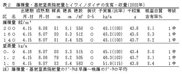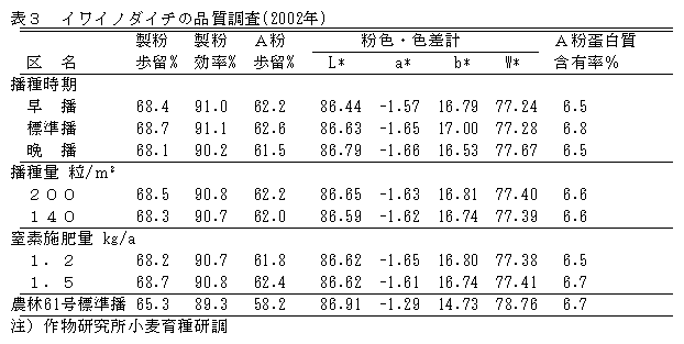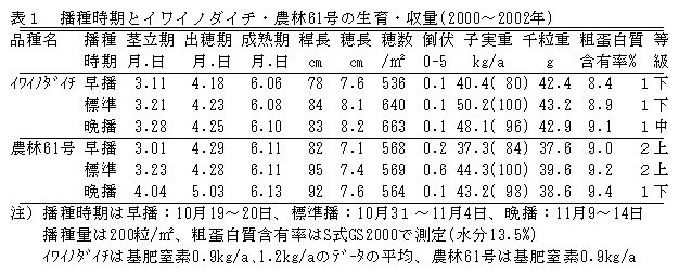 イワイノダイチの播種適期は、農林61号と同様標準播の時期である。播種量は標準量の200粒/m2から3割減の140粒/m2で差がなく、基肥窒素施肥量は農林61号より6~7割程度の増肥がよい。 |