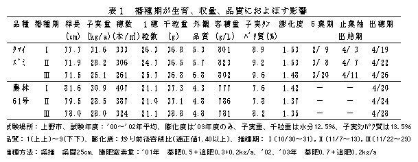 「タマイズミ」の播種適期は11月上中旬であり、基肥に窒素0.7kg/a程度を施用し、6葉期に窒素0.2~0.4kg/a、止葉抽出始期及び穂揃期に各窒素0.2kg/a程度を追肥する施肥体系が、収量、品質の安定的確保に有効である。 |