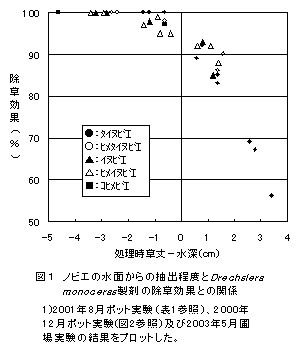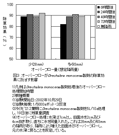 Drechslera monoceras製剤はノビエが水面から抽出していなければ、ノビエの種類に関係なく高い除草効果が得られる。また、温度が高くなること及び処理直後のオーバーフローにより、本製剤の除草効果は低下する。 |