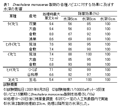 [キーワード]雑草、ノビエ、微生物除草剤、Drechslera monoceras、除草効果、水深 |
