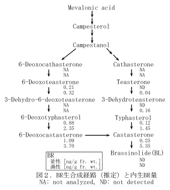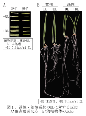 uzu遺伝子を持つ半矮性オオムギは、ブラシノライド(BL)感受性が低下し、ブラシノステロイド(BRs)を多量に蓄積している。uzu遺伝子の多面発現により生じる形態的変化「渦性」は、BR受容体遺伝子上の1塩基置換による1アミノ酸変異に起因する。 |