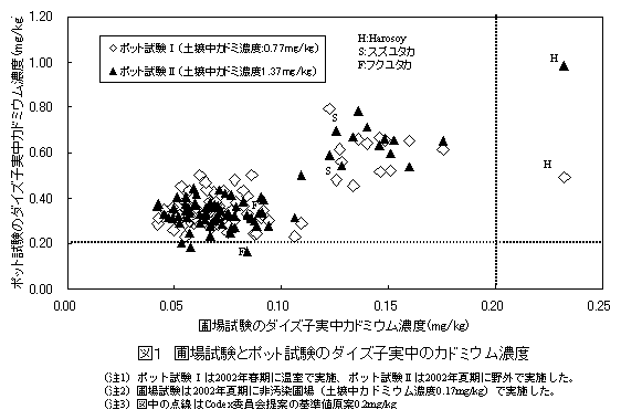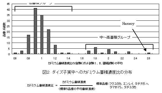 Codex委員会で提案されているカドミウム含量の許容基準値原案は、ダイズでは0.2mg/kgであるが、2002年12月に公表された農林水産省の調査結果では国産ダイズの16%が提案基準値を超えていた。一方ダイズ子実中へのカドミウム蓄積濃度には品種間差異があることが報告され、カドミウム蓄積濃度の低い品種の作付けが国産ダイズのカドミウム対策の一つの柱と考えられるようになっている。 |