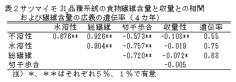 サツマイモ塊根に含まれる食物繊維は、ビフィズス菌類を活性化する機能を有し、その食物繊維含量には明確な品種間差異が認められ、広義の遺伝率は比較的高い。また、水溶性食物繊維含量と収量との関連は認められず、収量性を損なうことになしに、食物繊維含量の高いサツマイモを選抜育種することが可能である。 |