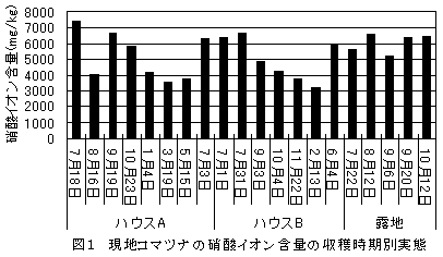過剰な施肥は土壌の塩類集積を引き起こすとともに作物の品質にも影響を与える。特に、葉菜類では多施肥が収穫物の硝酸イオン含量を高める要因となっている。硝酸は作物中に過剰に存在すると健康に影響を与えることが知られておりその低減化が求められている。 |