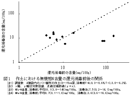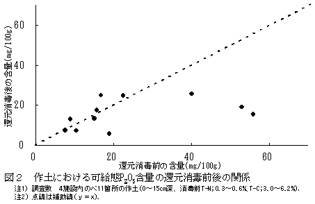 土壌還元消毒を行うと作土の無機態N、可給態P2O5、交換性陽イオンは消毒前の含量が少ない場合には増加し、多い場合には減少する傾向にある。ふすまの窒素分解率は18~43%で、施設内土壌によって異なる |