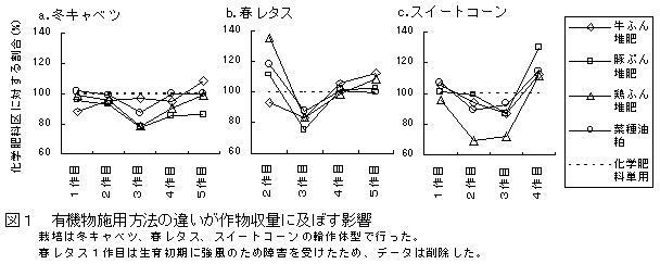有機質肥料や有機質資材を用いることにより、化学肥料の削減を目標とした栽培体型が推進されている。その一方で、有機物中の窒素の肥効を適正に評価せず、作物の安定生産を重視するために多施用となり、過剰な窒素が土壌中に蓄積し、硝酸性窒素による環境汚染を招くことが知られている。減化学肥料栽培と環境保全とが両立した有機質連用栽培を可能とするために、有機質投入時点とそれ以降の窒素の肥効を評価する。 |