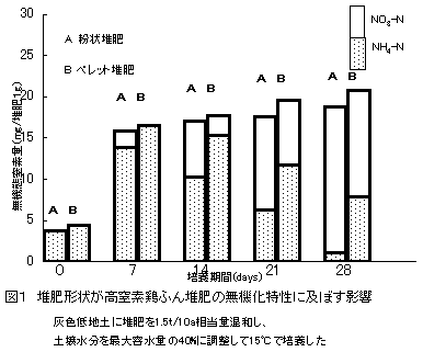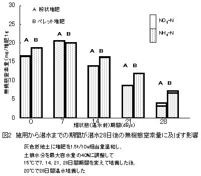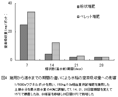 窒素含有率が5%以上で、その50%を尿酸態窒素の形で保持している高窒素鶏ふん堆肥を水稲基肥に利用する場合、湛水による肥効の低下を考慮すると、粉状堆肥の場合は湛水前7日以内、ペレット堆肥の場合は14日以内に施用することが望ましい。 |