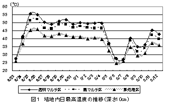 クリプトモス養液栽培培地を被覆資材に透明マルチを用いて、太陽熱消毒すると、培地内温度が50℃以上となり、イチゴ萎黄病に対して高い防除効果がある。 |