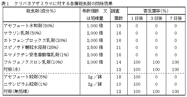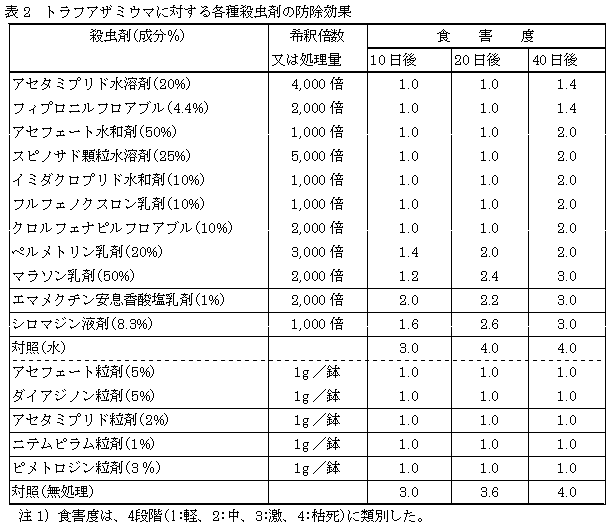 [キーワード]クリバネアザミウマ、トラフアザミウマ、防除、アセフェート水和剤、アセフェート粒剤 |