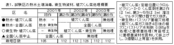 初作にパスツリア菌を全面処理し、次作以降クロルピクリン・D-Dくん蒸剤の植穴くん蒸処理およびパスツリア菌の植穴少量処理と菌根菌定着苗の定植を行う体系は、施設トマトの線虫害を速やかに終息させ、体系処理中止後も線虫の密度回復を抑制する。 |