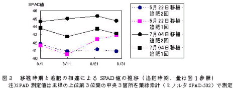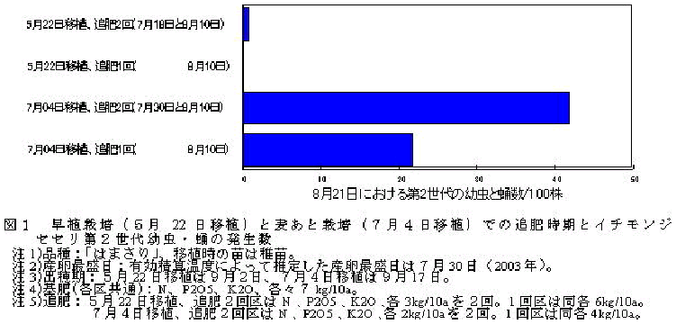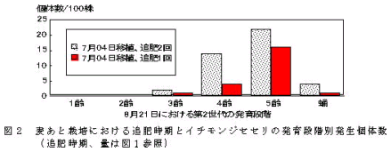 飼料用イネ栽培でのイチモンジセセリによる被害を回避する技術として、栽培時期の早期化が著しく有効である。麦あと栽培では、追肥時期を第1世代成虫が産卵を終了した後の8月10日頃以降とすることが発生抑制に有効であり、産卵期及び産卵期直前の追肥は発生を助長する。 |