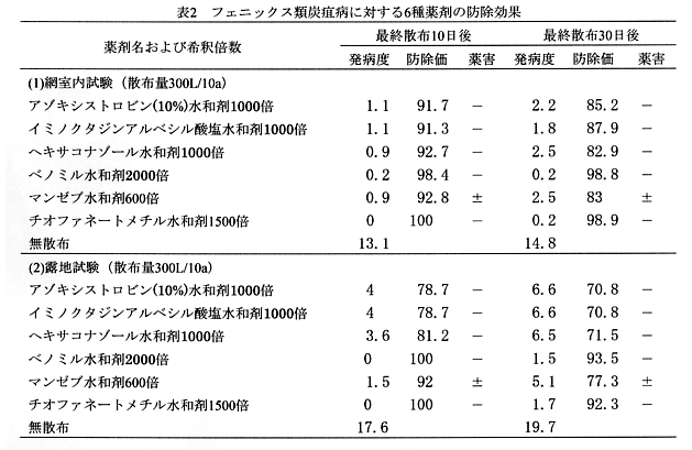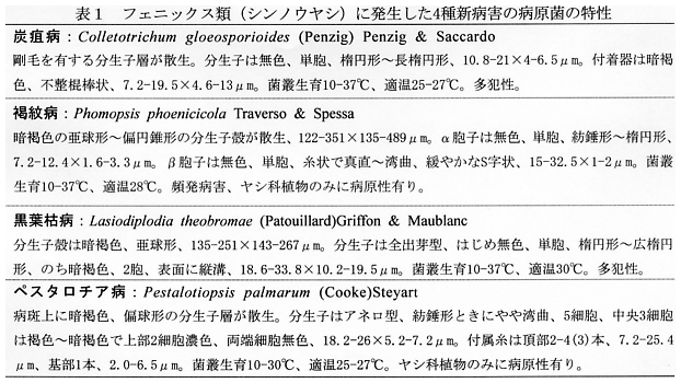 フェニックス類に発生する葉枯れ性病害の病原菌および炭疽病の防除薬剤 |