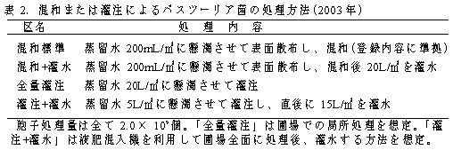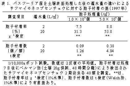 パスツーリア菌胞子懸濁液は、黒ボク土壌表面処理後に1平米当たり20Lの水を灌水するか、同量の水で灌注処理すると、サツマイモネコブセンチュウに対する胞子付着効率が高い。 |