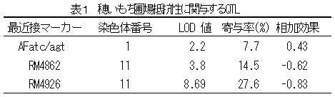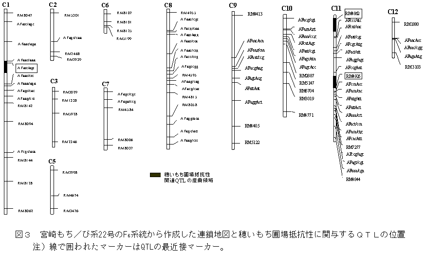 水稲品種「宮崎もち」の穂いもち圃場抵抗性には第1および第11染色体に座乗する3個のQTL(量的形質遺伝子座)が関与している。 |