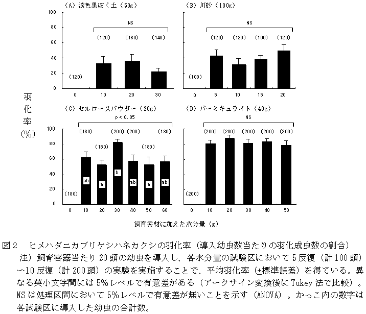 ハダニ類の土着天敵ヒメハダニカブリケシハネカクシの蛹の保存法に関して、水分調節を施したバーミキュライトやセルロースパウダーを飼育資材とすることで、高い羽化率を得ることができる。 |