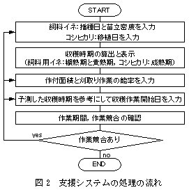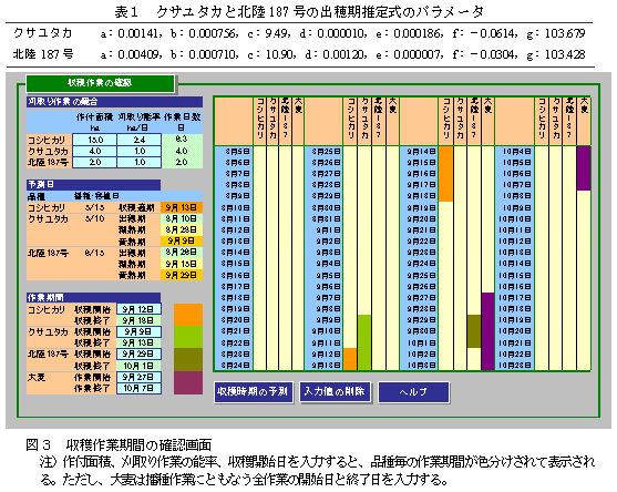 飼料イネと「コシヒカリ」との作業競合を回避した播種・収穫作業の計画を支援するソフトウエアである。播種・移植日等を入力すると収穫期が算出・表示され、作付面積、収穫作業能率、収穫作業開始日を入力すると収穫作業期間等が表示される。 |