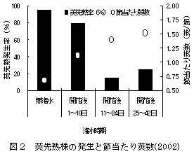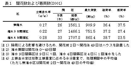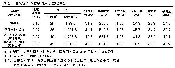 干ばつ条件下において、大豆の開花後11~24日(莢伸長期)または開花後25~42日(粒肥大期)に潅水することにより、開花数は増加し、その結果稔実莢数が確保されるため、莢先熟株の発生を抑止できる。 |