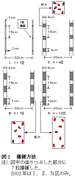 富山県では「コシヒカリ」による直播栽培面積が年々増加し、平成15年度には722haと水稲作付面積の1.8%に達している。また、近年の温暖化傾向の中、異常高温を回避し作期を分散するためにも、直播栽培は有効である。しかし、直播栽培は移植栽培に比べ、茎質が劣るために、倒伏しやすくなるとともに、籾数を確保しにくいために、収量はやや低い状況にある。そこで、湛水土中点播栽培において1株当たりの播種面積を変えた場合の分げつ発生と茎質の関係を解明し、茎質向上により倒伏を軽減するとともに、1穂籾数を確保し、安定した収量を得るための播種方法の開発を目指す。 |