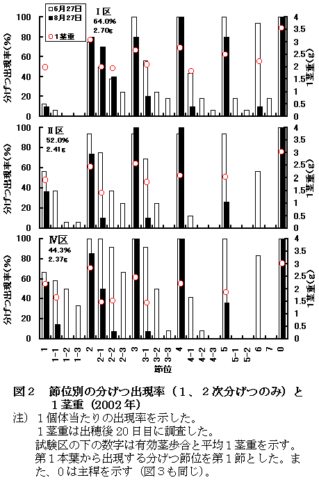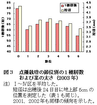 「コシヒカリ」の湛水土中点播栽培における1株当たりの播種面積を小さくすることにより低節位および高節位の無効分げつの発生が少なくなり茎質が向上する。その結果、1穂籾数が確保されるとともに、倒伏が軽減される。 |