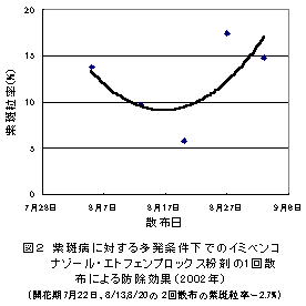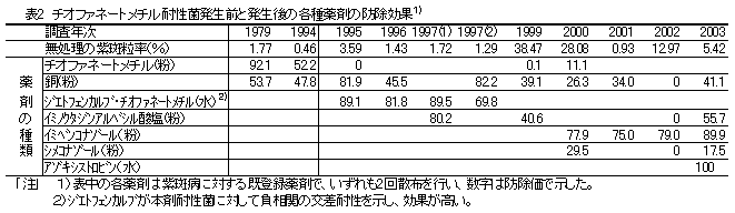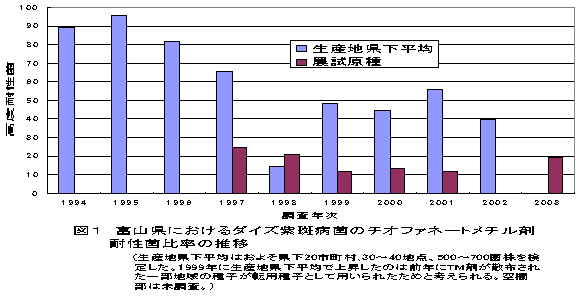 紫斑病のチオファネートメチル剤耐性菌比率は薬剤の使用中止後、一定レベル以下には下がらず、また一旦使うとすぐに急上昇することから、再使用は難しい。最近登録された薬剤の中で、アゾキシストロビン剤やイミベンコナゾール剤の防除効果が高い。 |