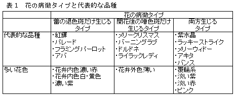 チューリップ微斑モザイク病発病株を効率的に除去するための病徴指標 |