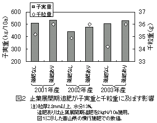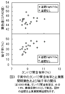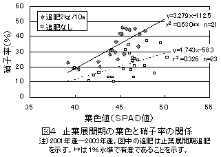 砂壌土において「ファイバースノウ」の硝子率は、子実中のタンパク質含有率と関係が深く、止葉展開期の葉色が濃い場合や止葉展開期の追肥施用により高くなる。硝子率を40%以下に抑えるためには、止葉展開期の葉色がSPAD値で45以上の場合は、追肥を控える。 |