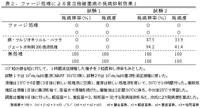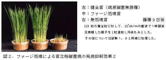 イネ種子を浸種・催芽する際に、イネ苗立枯細菌病菌に対して親和性を持つファージを大量に投与することにより、本病の発病を著しく抑制することができる。 |
