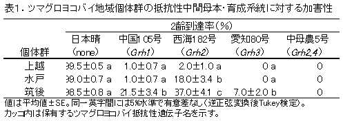 イネのツマグロヨコバイ抵抗性中間母本・育成系統に対する本種の加害性は地域個体群間で異なるが、ツマグロヨコバイ抵抗性準同質遺伝子系統は圃場における本種の生息密度を低く抑える。 |