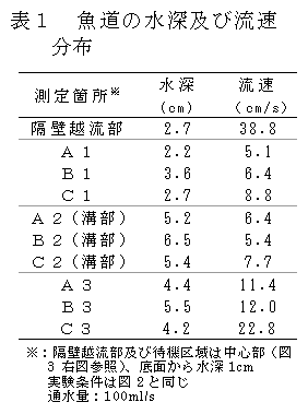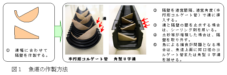 市販の半円形ポリエチレン製コルゲート管と、その溝に脱着可能な隔壁を挿入して構成した魚道は、簡単かつ安価に作製でき、魚道内の堆積土砂等を除去できる。また、魚類はコルゲート管の溝に待機しながら遡上する。 |