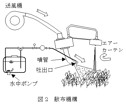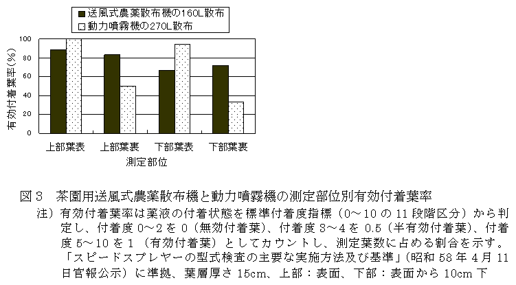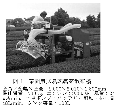 茶園用送風式農薬散布機は、送風機と低圧ポンプを用いた小型の乗用型ミスト機である。葉層内部への薬液到達性が高いため、動力噴霧機を用いた農薬散布と比較して、散布量を削減しても茶葉の裏面への薬液付着が良い。 |