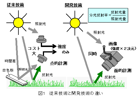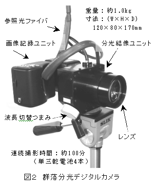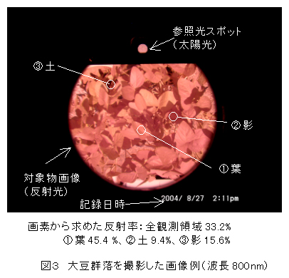 大豆や水稲群落の反射光と太陽光など参照光を同時に同一画面上に分光して撮影するデジタルカメラである。生育診断に有効な550nm,800nm,950nm3波長の分光反射率を面的情報として得ることができる。 |