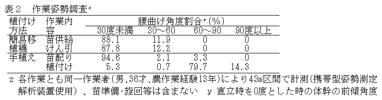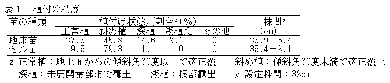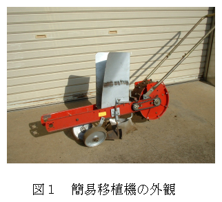 開発した移植機は2人組作業による人力けん引・人力苗供給方式で、簡易な構造であるため小型・軽量である。本機を用いることにより植え付け時の作業姿勢が大幅に改善され、60度以上の腰曲げ作業が解消できる。植え付け精度は市販機に比べ斜め植えになる割合が高いが、収量・品質は手植えと同程度である。 |