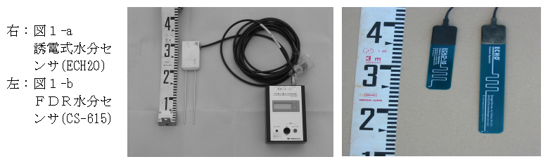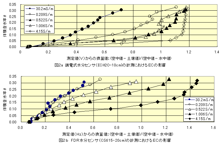 市販の誘電式水分センサ(ECH2O)は、土壌塩分の影響が小さいと言われているが、実際にはわずかな土壌塩分変化でも激変して現場での使用は困難である。FDR水分センサ(CS-615)は、0.2S/mまでの低濃度の土壌塩分範囲内で限定使用できる。 |