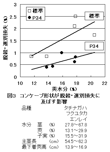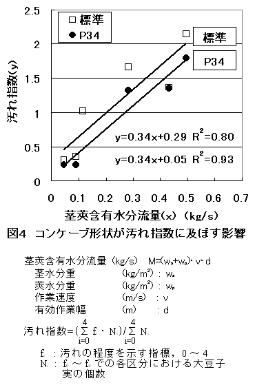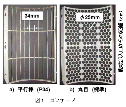 コンバインによる大豆収穫作業では、青立ち株や雑草等の混入による汚粒が問題となっている。軸流コンバインでは排塵弁角度を大きくすることによって茎莢の通過性が向上し汚粒は低減するが、脱穀・選別損失が増加する等の問題がある。また、汚粒低減を目的としたコンケーブはない。 |