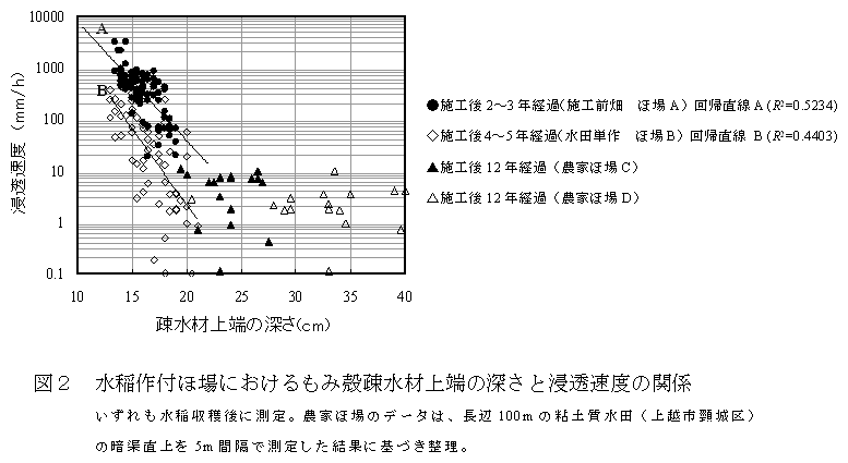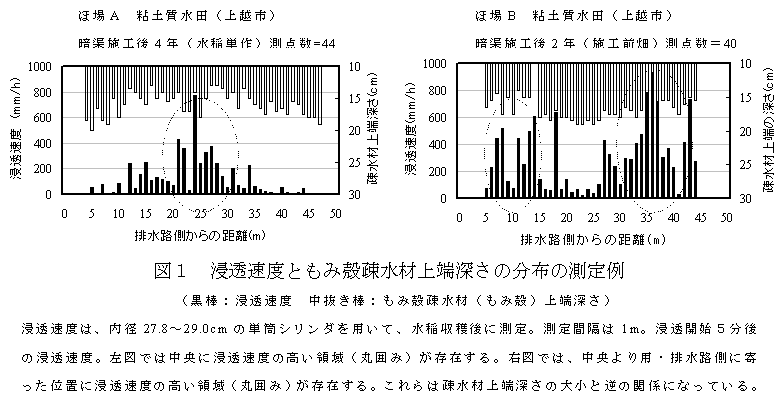 暗渠直上には,浸透の良好な場所と不良な場所がまとまりを持って分布している。この変動は主に暗渠もみ殻疎水材上端の深さの変動によってもたらされており、疎水材上端の深さが13cmから20cmに低下すると、暗渠直上の浸透速度は、1/100に低下する。 |