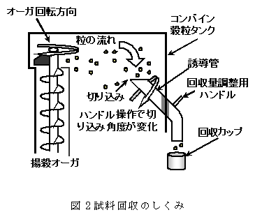 コンバインタンクから誘導管により一部の収穫物を外部へ取り出すことで品質分析のための試料を回収する。GPSを用いることで任意の位置での試料回収が可能である。回収した試料を分析することで品質のばらつきを把握できる。 |