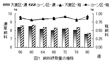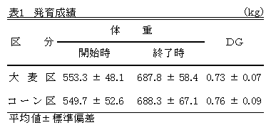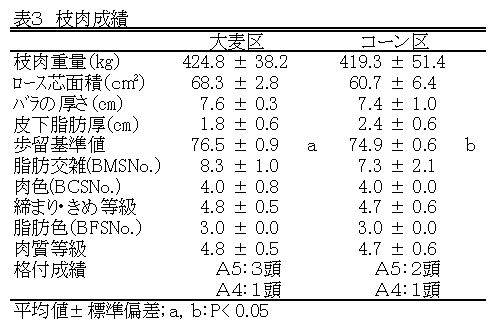 黒毛和種去勢牛7頭を用いて、出荷前6ヵ月間の大麦圧扁とスチームフレークトウモロコシ給与による発育、飼料摂取量、枝肉成績および蓄積脂肪の脂肪酸組成に差は見られない。 |