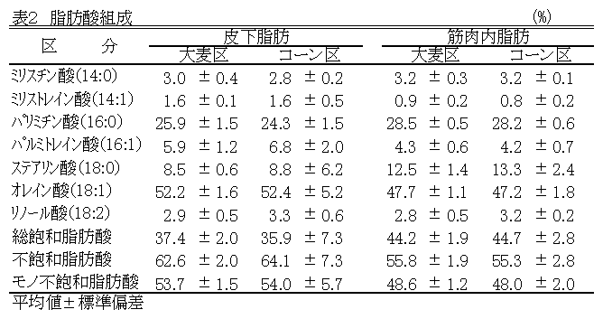 トウモロコシを給与すると大麦給与時に比べ蓄積脂肪中のリノール酸およびオレイン酸の割合が高くなり、脂肪融点が低くなることが報告されている。しかし、穀類の給与期間と脂肪酸組成との関係についての研究は少ない。 |
