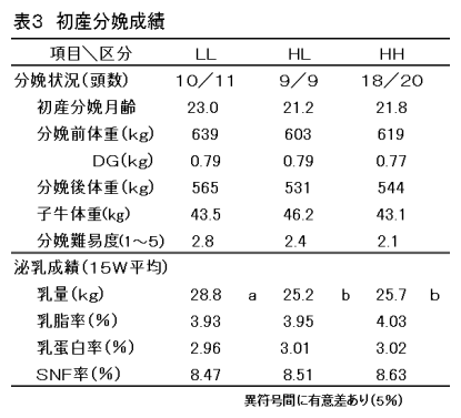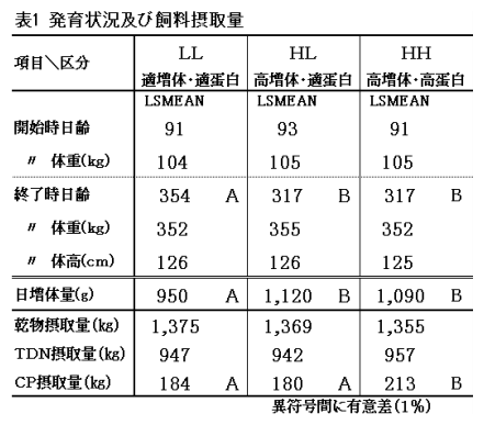 乳用種雌子牛40頭を設定した日増体量(以下DG)及び給与飼料中のCP含量に基づいて3試験区に振り分け、生後90日齢から体重が350kgを超えるまでの期間のDGを高めて、初産分娩月齢を早期化した場合の発育、繁殖、分娩および乳生産に及ぼす影響について検討した。試験区分は目標DGを750g、CPを14%程度とするLL区、DGを1,000g、CPを14%程度とするHL区、DGを1,000g、CPを16%程度とするHH区の3区とした。なお、試験終了後は各県の慣行法で管理した。 |