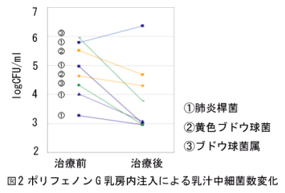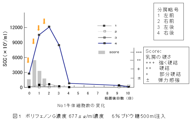 茶抽出物で遊走される免疫細胞の効果により乳房炎症状の改善が可能である。茶抽出物を乳房炎罹患乳房に注入すると体細胞の増加、細菌数の減少を経て症状が軽減する。 |
