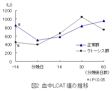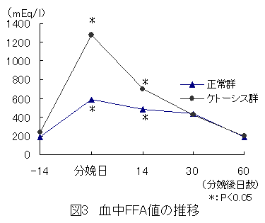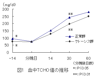 ケトーシス群(5頭)と正常群(5頭)について、定期血液検査を実施した。なお、ケトーシスの診断基準は臨床異常(元気食欲の低下等)がみられ、乳汁中ケトン体(3-ヒドロキシ酪酸)200μmol/l以上と規定した。 |