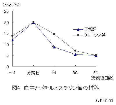 ケトーシスを発症した乳牛では分娩2週間後における血中3-メチルヒスチジン濃度が有意に高く、体タンパク質の動員が正常牛よりも大きいことが認められた。このため、ケトーシスの病態改善には、タンパク質の補給が必要と推察される。 |